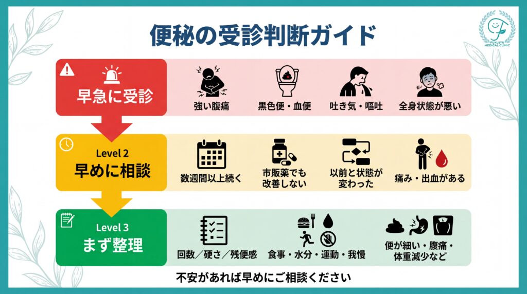 「単なる便秘か」「確認が必要な便秘か」を整理し、