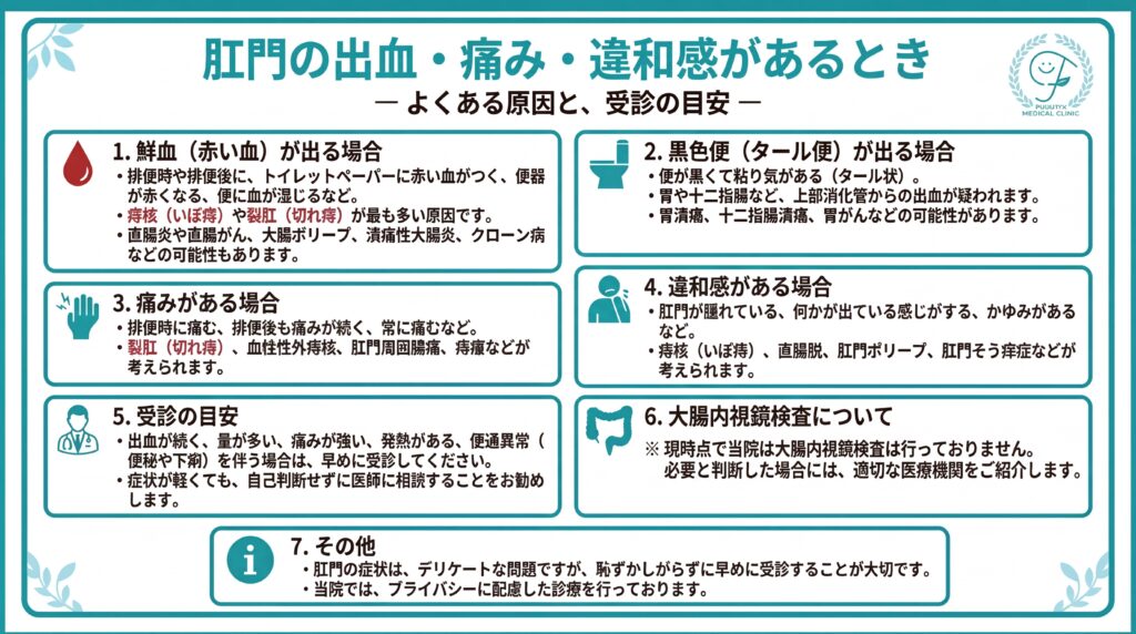 肛門の出血や違和感は、痔が原因のことも多いですが、